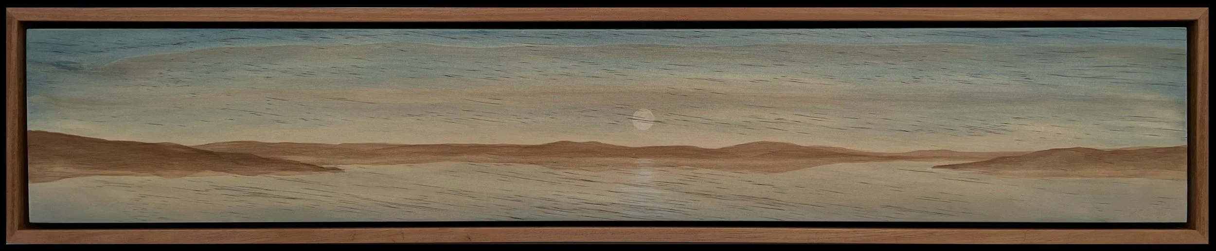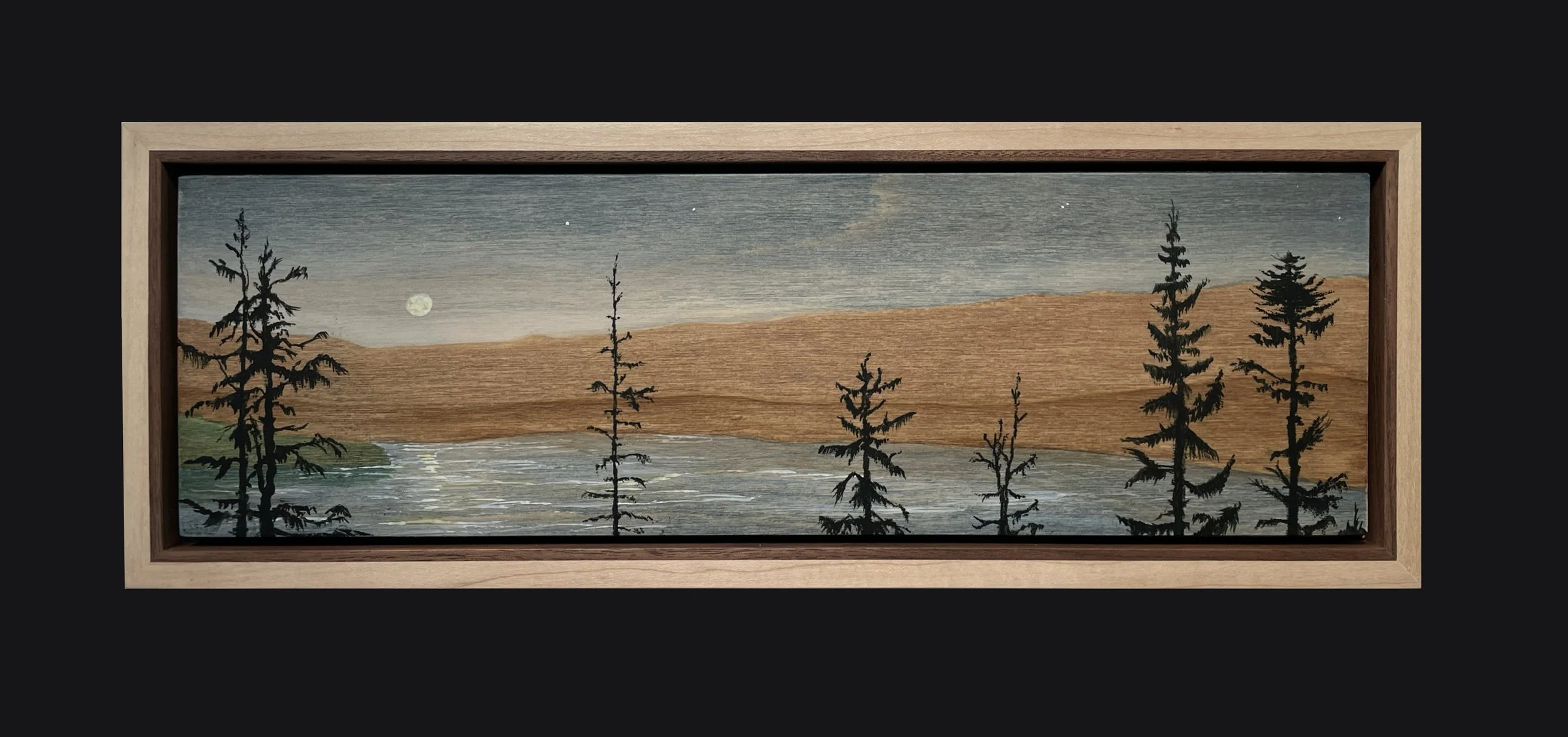 Staintings are landscape art where natural wood grain patterns suggest the landscape contours. The wood surface is enhanced by dyeing and other painting techniques to create the landscape imagery. Each piece is finished with an original hardwood frame.